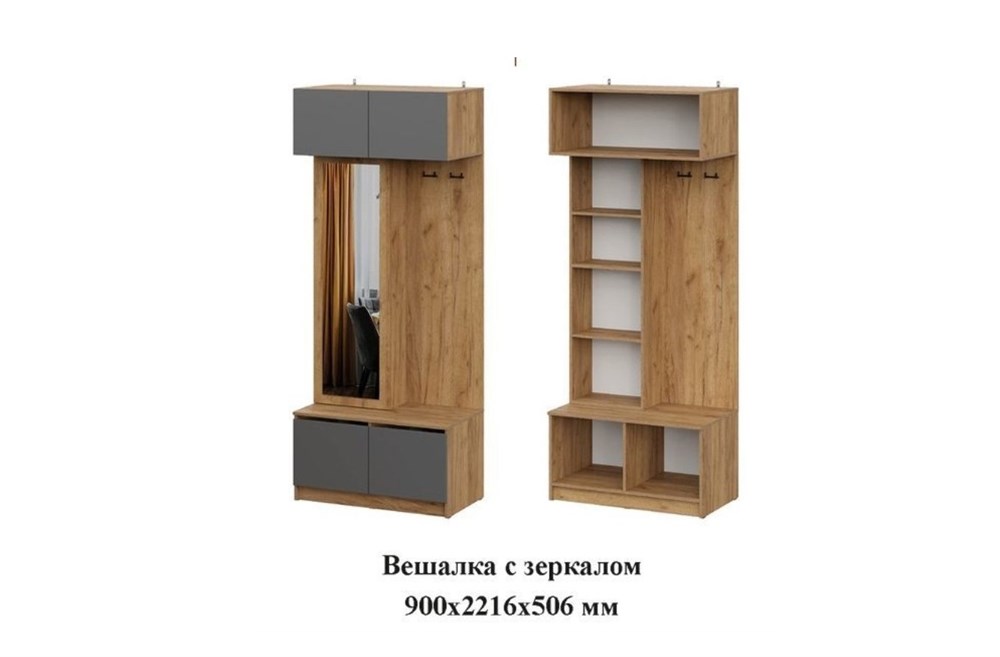 Вешалка с зеркалом имеет 2 двойных крючка, нижнюю нишу, разделенную перегородкой, и верхнюю нишу без перегородки. По центру встроен шкаф-
