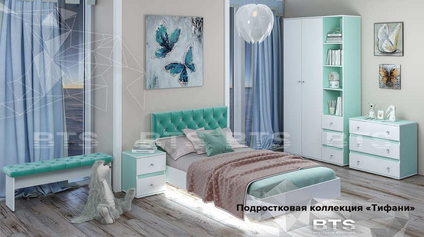 Нежно-бирюзовые тона корпусов коллекции, в обрамлении снежно-белой кромки идеально гармонируют с белыми фасадами, украшенными ювелирными ручками. Полноразмерная "парящая" кровать с нижней подсветкой декорирована мягким изголовьем из благородного бархата цвета "Тифани" с сияющими стразами. Туалетный столик оснащен подсветкой, розеткой и выключателем . Неоспоримой изюминкой туалетного столика является съемное стеклянное покрытие столешницы с фацетной кромкой. "Тифани" - изящество и утонченность истинных леди!
