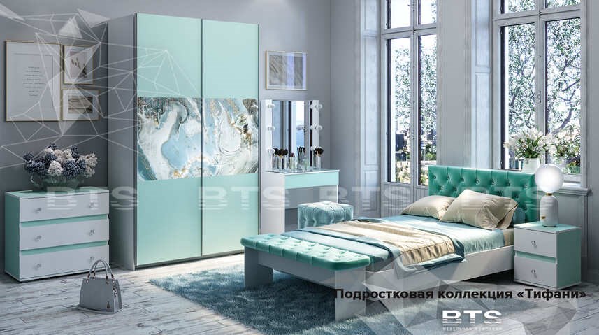 Нежно-бирюзовые тона корпусов коллекции, в обрамлении снежно-белой кромки идеально гармонируют с белыми фасадами, украшенными ювелирными ручками. Полноразмерная "парящая" кровать с нижней подсветкой декорирована мягким изголовьем из благородного бархата цвета "Тифани" с сияющими стразами. Туалетный столик оснащен подсветкой, розеткой и выключателем . Неоспоримой изюминкой туалетного столика является съемное стеклянное покрытие столешницы с фацетной кромкой. "Тифани" - изящество и утонченность истинных леди!