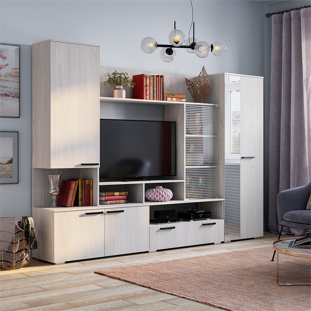 Грамотно продуманная система хранения оснащена закрытым двустворчатым шкафом, пеналом, зоной под ТВ, открытыми и закрытыми полками, на которых можно разместить домашнюю акустику, любимые книги или изящные статуэтки. Всё это позволяет максимально эффективно использовать пространство. С одной из сторон ТВ-зоны находятся три полки со стеклянной дверцей. Особый шарм ей придаёт пескоструйный декор в виде горизонтальных линий по всей площади поверхности. В едином стиле декорировано стекло, прилегающее к ближайшей створке распашного шкафа. Шкаф состоит из вместительной зоны с горизонтальной хромированной штангой для хранения платяных изделий и антресольной полки.