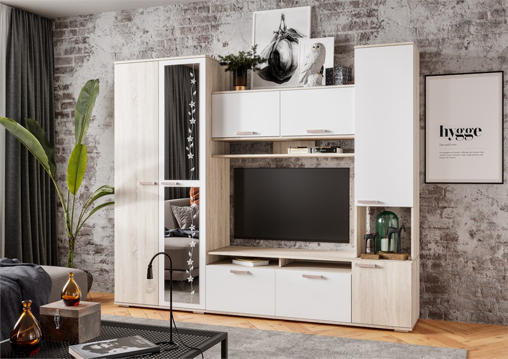 Компактный гарнитур «Лукас» – это функциональная стилизованная модель с простыми геометрическими формами и множеством полезного пространства. Контрастное сочетание фасадов белого цвета с древесной фактурой дуб сонома, а также отделка зеркалами станут ярким акцентом любого интерьера.