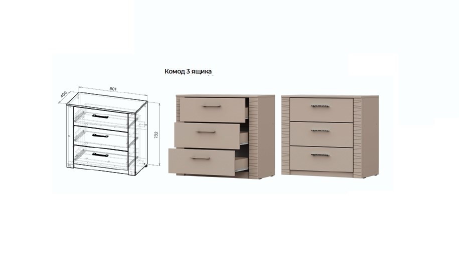 Комод c тремя выкатными ящиками на роликовых направляющих и декоративными элементами из МДФ с фрезеровкой от МС Гамма-20. Фасады накладные.