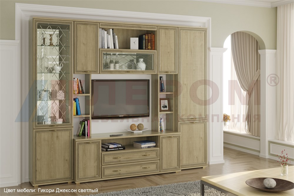 Фасад имеет уникальное сочетание глубокого тиснения и эффекта патины, присущей классическому стилю. Изящество фасада подчеркивает стекло с алмазной гравировкой и фацетом. Мебель изготавливается из высококачественных материалов: ЛДСП, МДФ (фасад).