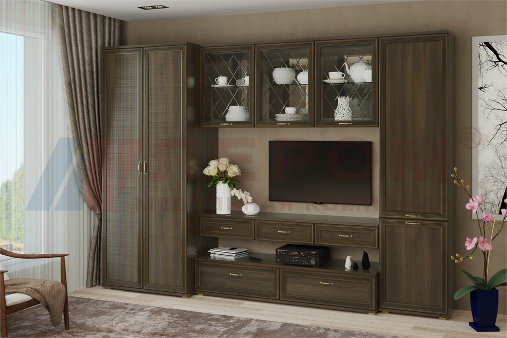Фасад имеет уникальное сочетание глубокого тиснения и эффекта патины, присущей классическому стилю. Изящество фасада подчеркивает стекло с алмазной гравировкой и фацетом. Мебель изготавливается из высококачественных материалов: ЛДСП, МДФ (фасад).