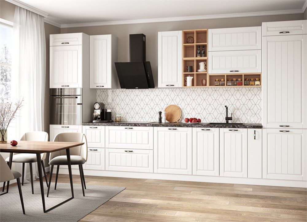 Благодаря индивидуальной комплектации, можно собрать недорогой и стильный кухонный комплект, который идеально впишется в современные интерьеры кухонного пространства. Использование модулей со светлыми оттенками фасадов и серым корпусом поможет создать в небольшом помещении визуальное ощущение простора и большого пространства. Темные фасады в сочетании с серыми деталями корпуса внесут в обстановку кухни благородство и элегантность. Отделанные стеклянными вставками верхние навесные шкафы сделают верхнюю линию кухонного комплекта более легкой и воздушной. Все представленные в линейке «Империя» модули имеют современное наполнение, состоящие их полок, сушилок, баров и хлебниц, в которых удобно разместится вся кухонная утварь и припасы. При сборке подходящего модуля можно использовать шкафы различной высоты и глубины, которые оптимально вписываются в конкретную планировку кухни. Фасады имеют резную отделку в форме прямоугольных контуров, которые придают им элегантность и свежесть. Все кромки облицовки закрыты пленкой ПВХ, защищающей ламинированную поверхность. Для сборки модулей использовался качественный материал, который позволяет недорогому кухонному гарнитуру сохранить первозданный внешний вид на протяжении длительного периода времени.