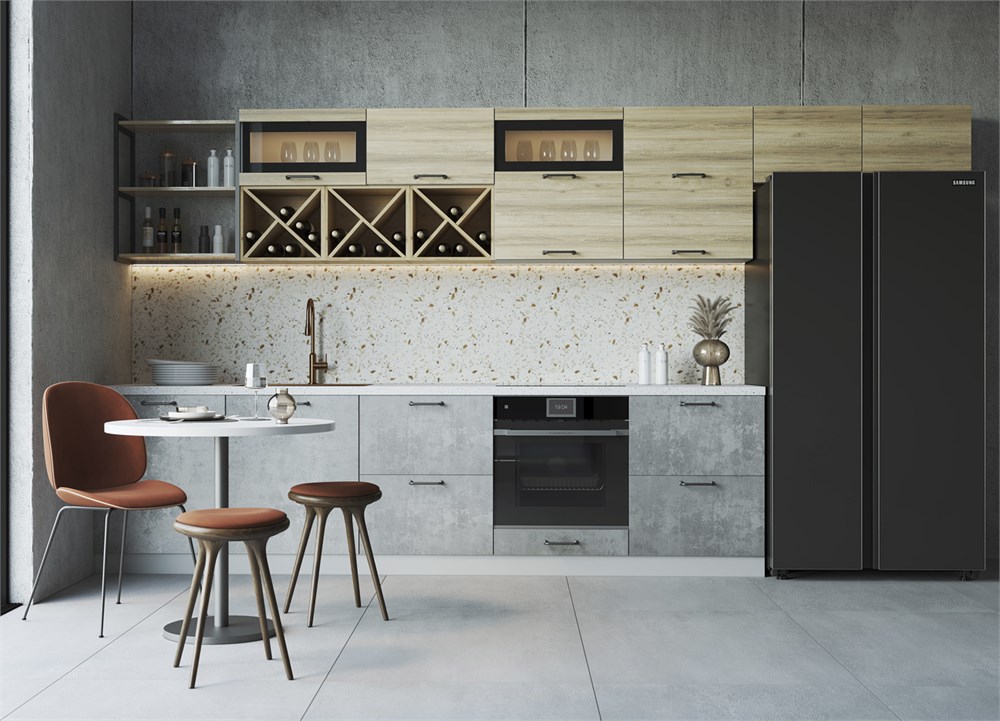 Полюбившийся нам индустриальный дух лофта воплотить на своей кухне несложно, главное – чтобы всё выглядело гармонично и функционально. Высокие потолки с открытыми лабиринтами труб, рулонные шторы, фрагмент голой кирпичной кладки, пол, а возможно и одна стена из бетона – всё это как нельзя лучше будут гармонировать с кухонным гарнитуром «Лофт». Кухонные шкафы в предложенной цветовой гамме будут прекрасно сочетаться с открытым бетоном, и придадут вашей индустриальной обстановке нотку элегантной современности, не нарушая при этом законов стиля. В зависимости от того, какие цвета присутствуют в интерьере, и насколько хорошо освещена ваша кухня, вы можете выбрать соответствующие оттенки фасадов. Примите во внимание, что на выбор цветовой гаммы влияет и размер помещения. Если оно выступает, как зона в едином большом пространстве, можно выбрать темные фасады (например «Дуб бурый») для маленькой кухни более предпочтительный светлые варианты, такие, как «Дуб майский». Дверцы из матового стекла можно поддержать светильниками в том же стиле, геометрической формы мебельные ручки помогают создать правильную атмосферу. Нотку мягкости придаёт включение в гарнитур деревянных фасадов. Все оттенки — бетона и дуба цикория соответствуют выбранной стилистике. Преимуществом кухонной мебели в стиле лофт является не только её продуманный дизайн, который идеально вписывается в интерьер, но и высокое качество материалов, используемых в производстве. Качественная и геометрически простая мебель поможет вам грамотно организовать пространство в едином индустриальном стиле.