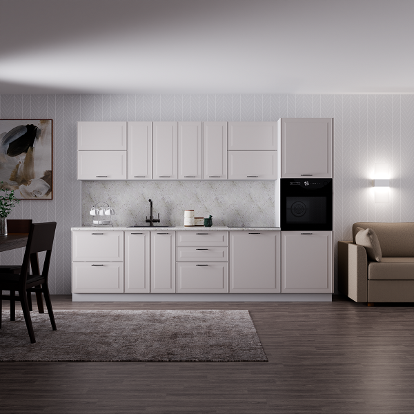 Кухня «Манго» — сложная фрезеровка в стиле неоклассика. Тонкая минималистичная рамка по периметру придает фасадам изысканность, а центральная часть с углублением в виде трехступенчатой «лесенки» добавляет объем и глубину.