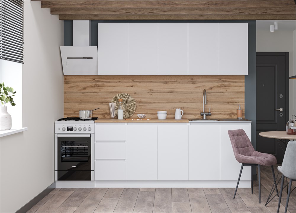Для фасадов были выбраны универсальные оттенки, наполняющие пространство ощущениями легкости. Белый — это классика любых минималистичных интерьеров. Он приобрел популярность с появлением моды на скандинавский стиль и теперь находит широкое применение в хай-теке, современном и классическом стилях. Простоту цвета и дизайна гарнитура можно разбавить яркими акцентами. С кухонным гарнитуров «Мори» легко создать практичное и стильное кухонное пространство. Смена цветовых акцентов (цветы, кухонные атрибуты, картины) позволит помещению всегда выглядеть свежо и неповторимо. В гарнитуре реализованы интегрированные ручки — они являются частью фасада. Это функциональное и практичное решение, имеющее ряд преимуществ перед классическими ручками. На них не практически не остаются загрязнения, за них невозможно зацепиться одеждой в процессе приготовления пищи. Кухня без ручек смотрится ультрасовременно, привлекает к себе внимание и вызывает комплименты. Гарнитур не является модульным и выпускается в стандартном размере 2.0 метра. Светлый оттенок гарнитура создает визуальный эффект расширения пространства, что особенно важно для малогабаритных помещений. Еще одна сильная сторона кухни — ее доступная цена, обусловленная использованием качественного, но недорогого материала ЛДСП. Материал устойчив к микроклимату кухни.