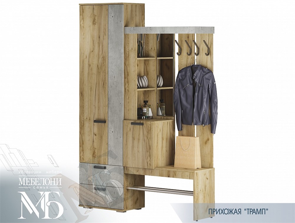 Прихожая Трамп придется по душе ценителям интерьеров в стиле лофт. Оригинальное цветовое решение, четкость и лаконичность линий, богатое наполнение — в этой модели есть всё, чтобы занять достойное место в вашем доме. Прихожая очень функциональна, что позволит разместить все необходимые вещи, сохранив при этом жилое пространство.