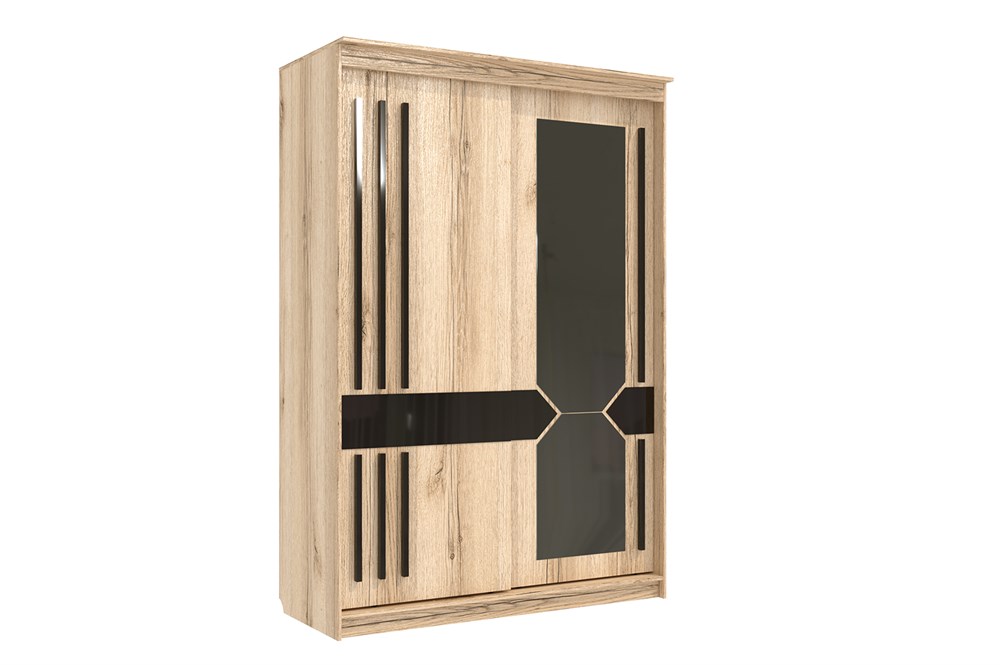 Створки шкафа комплектуются стеклянным декором нескольких видов и выделяются ручками из МДФ во всю высоту створки.
