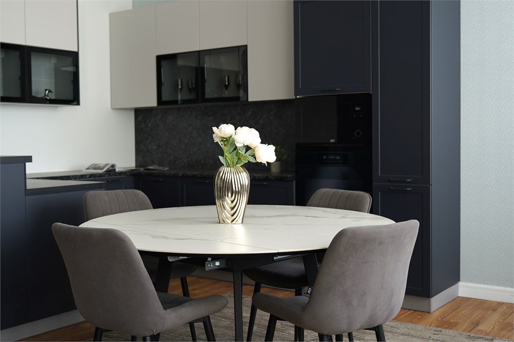 Этот материал не только прочный и долговечный, но и обладает прекрасной эстетикой, которая никого не оставит равнодушным. Функциональная столешница превращающаяся в идеальный круг и способная сделать любое застолье, по-настоящему, комфортным. Регулируемые, и в тоже время, шарнирные опоры позволяют выставить стол по уровню на любой поверхности. Автоматический плавный механизм раздвижения с регулировкой.