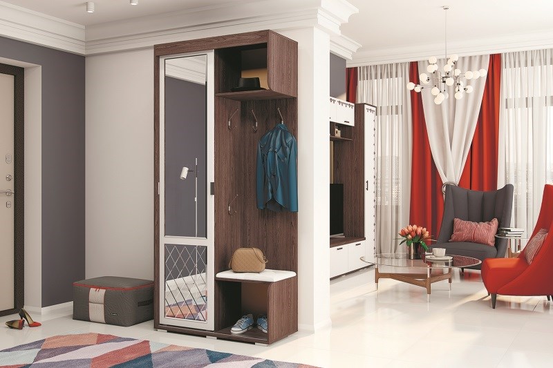 Пенал с двумя полками и выдвижной евроштангой оснащен полкой для головных уборов вверху и полкой для обуви внизу.