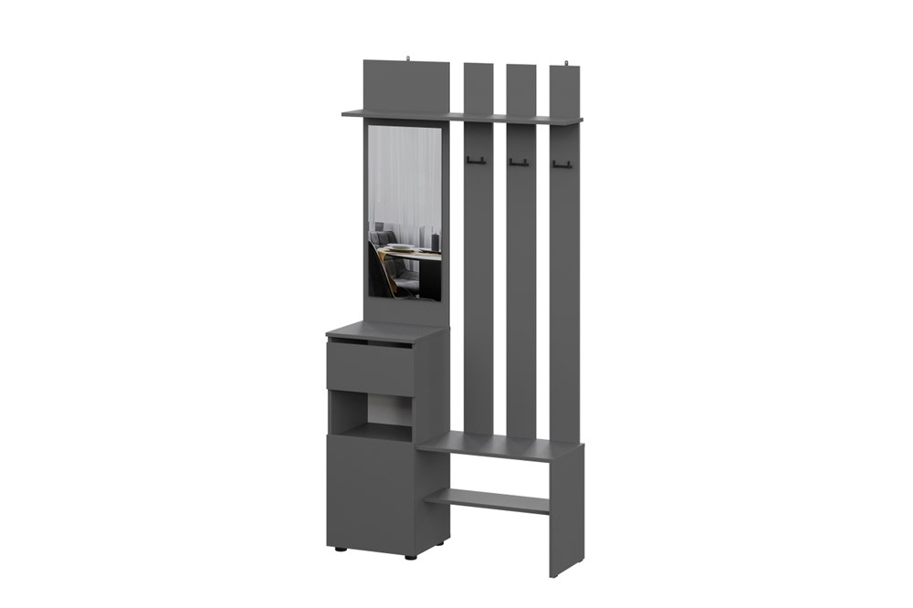 установлено зеркало, под вешалкой есть место хранения стеллажного типа, на верхнюю его полку можно ставить сумки, а на нижнюю полку сухую обувь.