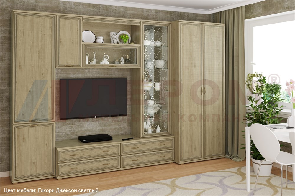 Фасад имеет уникальное сочетание глубокого тиснения и эффекта патины, присущей классическому стилю. Изящество фасада подчеркивает стекло с алмазной гравировкой и фацетом. Мебель изготавливается из высококачественных материалов: ЛДСП, МДФ (фасад).