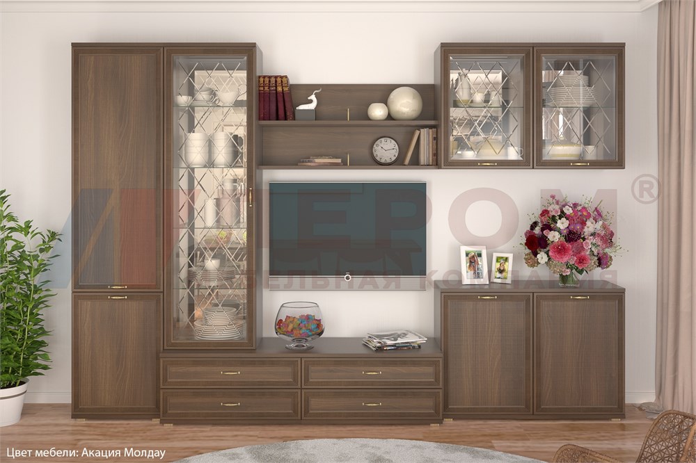 Фасад имеет уникальное сочетание глубокого тиснения и эффекта патины, присущей классическому стилю. Изящество фасада подчеркивает стекло с алмазной гравировкой и фацетом. Мебель изготавливается из высококачественных материалов: ЛДСП, МДФ (фасад).