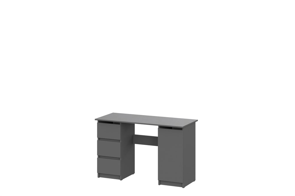 Стол письменый c распашной створкой, за которой расположен отсек для хранения с полкой и с секцией с тремя выкатными ящиками на роликовых направляющих. Фасады накладные. Сборка корпуса универсальная (стол собирается как на левую, так и на правую сторону). Габариты ящика (ШхВхГ) - 277х96х340 мм.