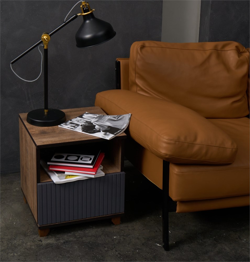 Незаменимый предмет мебели в спальной — это прикроватная тумба. Она позволит удобно и практично расположить предметы и личные вещи, необходимые перед сном и во время отдыха. Данная модель тумбы оснащена открытой нишей и выдвижным ящиком. Ящик оборудован шариковыми направляющими полного выдвижения. Удобство использования дополняет деревянная ручка из массива дуба. Регулируемые по высоте ножки выполнены из массива дерева. Выбрать нужное изделие поможет комбинирование цветов фасада ящика и корпуса.